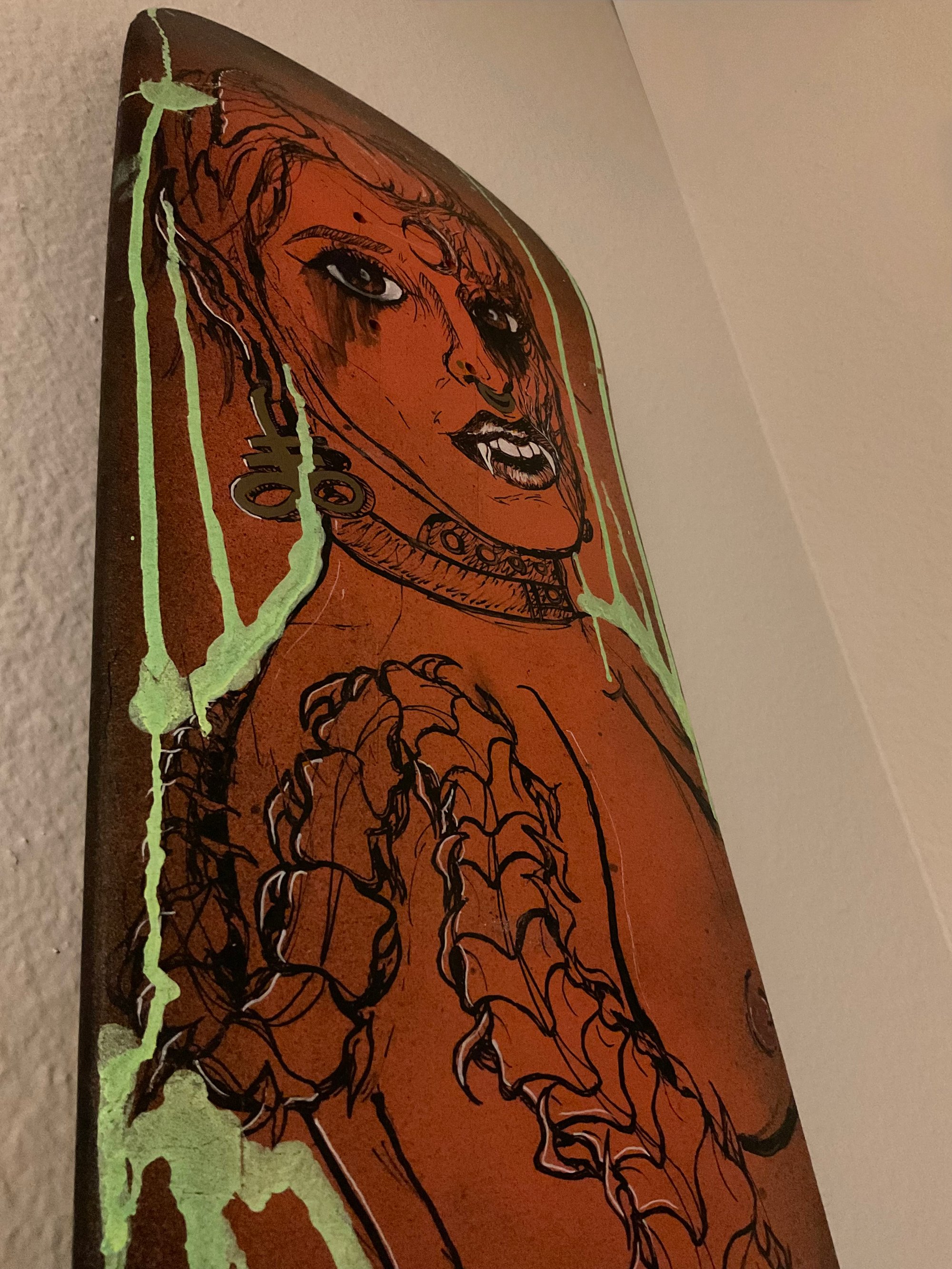 Spray paint and acrylics on a blank skate deck