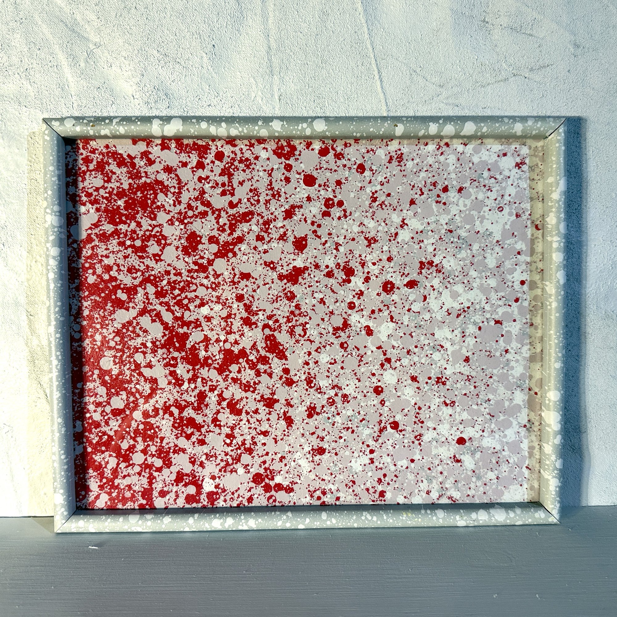 This 11.75x14.5 inch piece was created with an original method developed by FRO!. This canvas is painted with many layers of small droplets of pinks, light grey and white Flame Blue brand spray paints. Measurement includes frame
