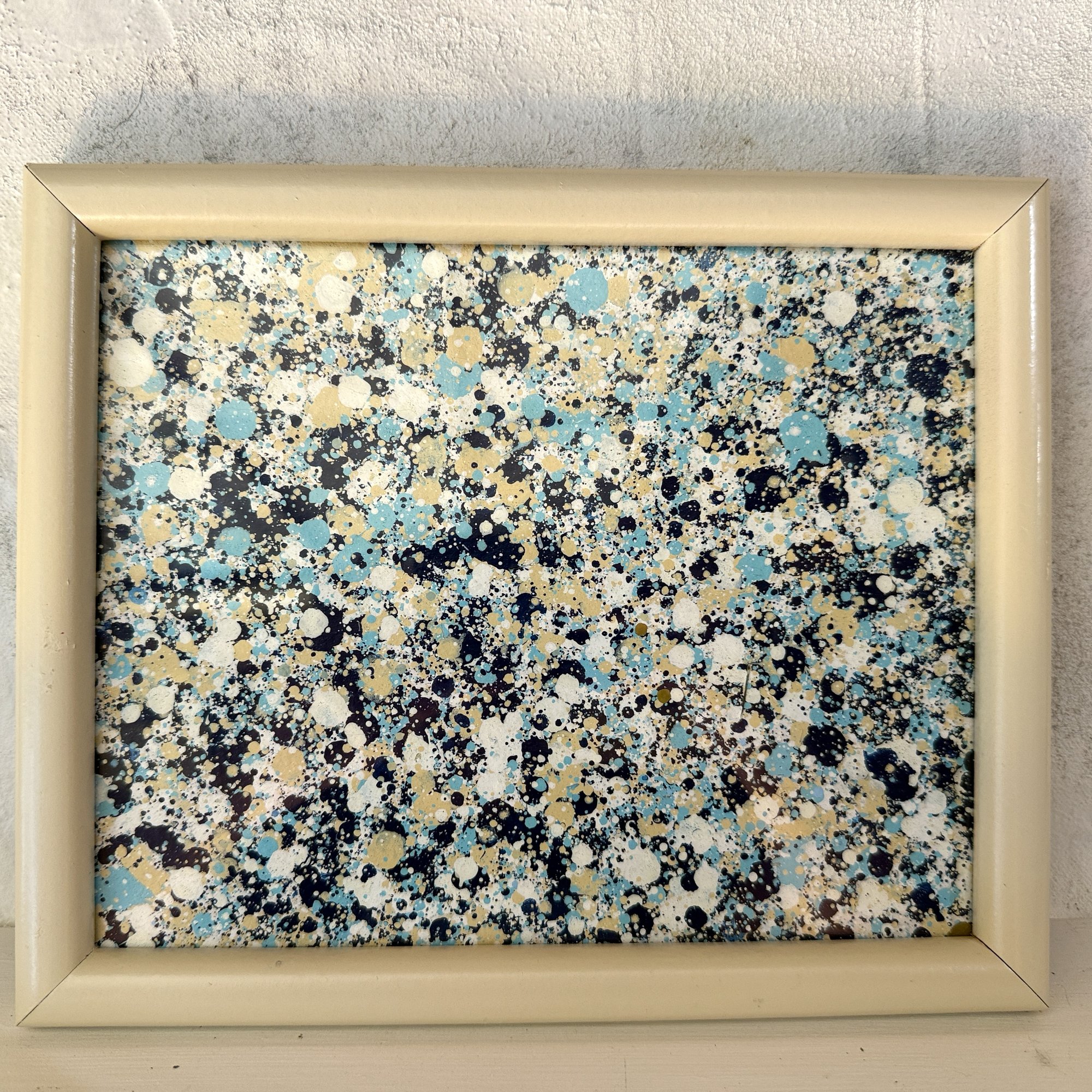 This 9.x11.25 inch piece was created with an original method developed by FRO!. This canvas is painted with many layers of small droplets of blues and clay Flame Blue brand spray paints. Measurement includes frame